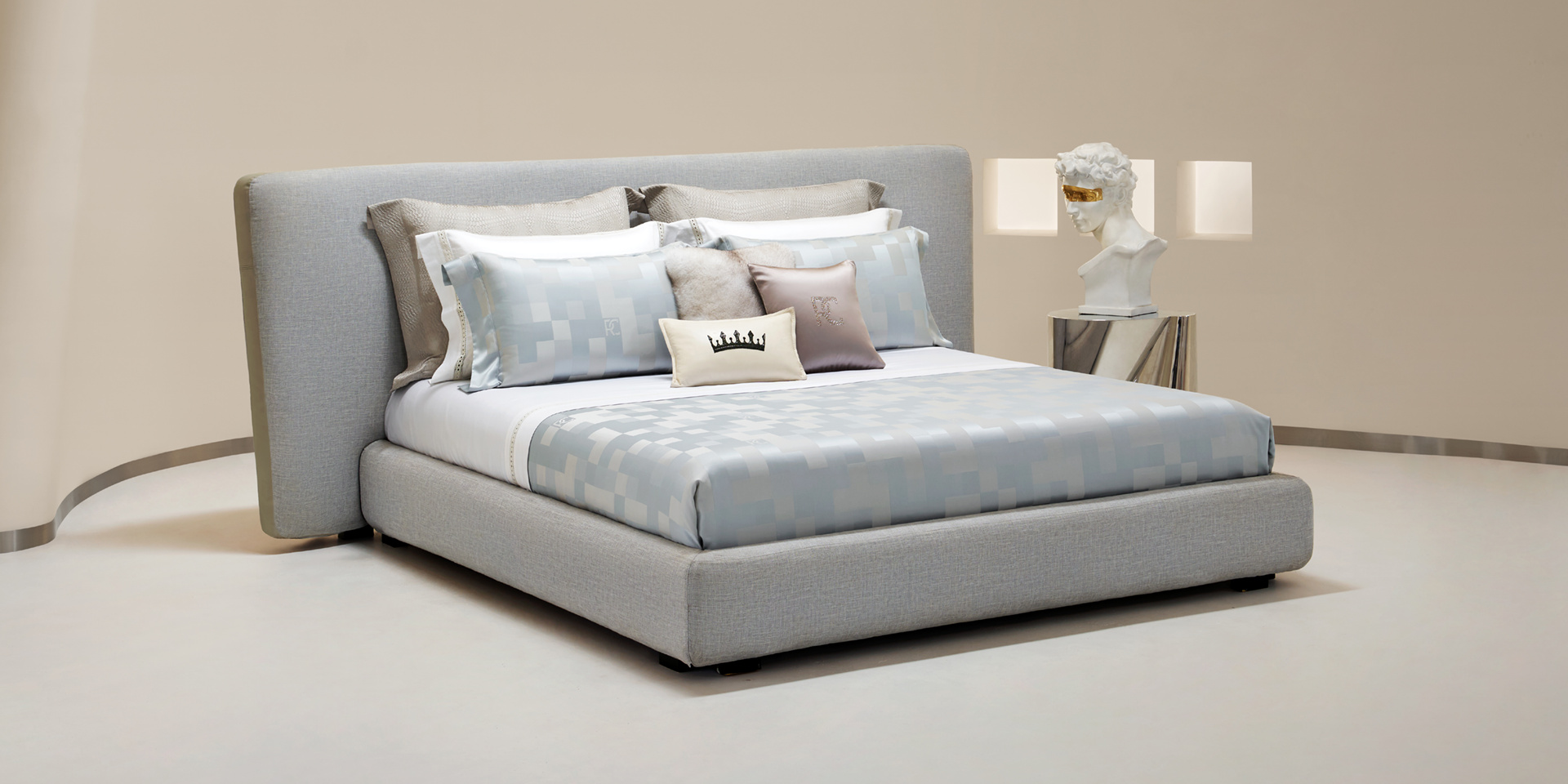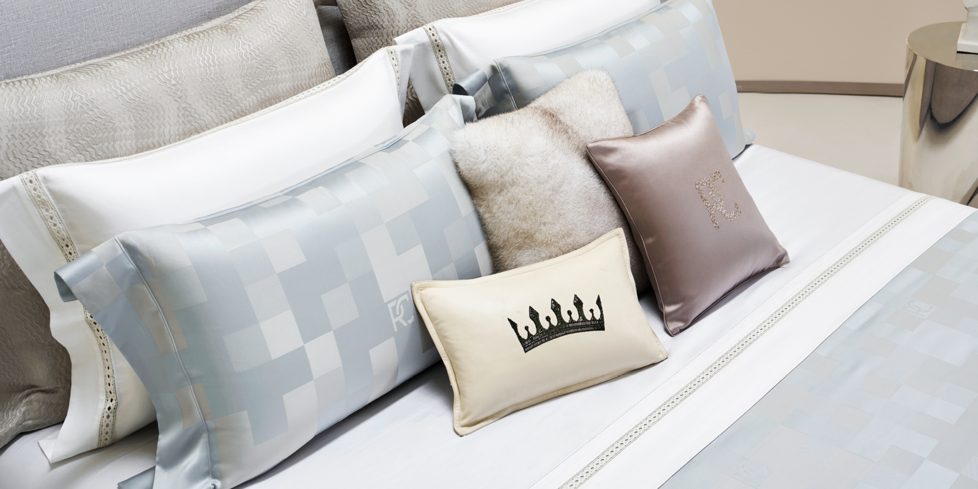 通过错落排布的经纬线构筑马赛克格形图案,忽明忽暗的层次变化形成光影流动般的质感。细腻纹理在光照之下浮现出微妙的立体效果,犹如艺术品般呈现床品的非凡工艺美感。