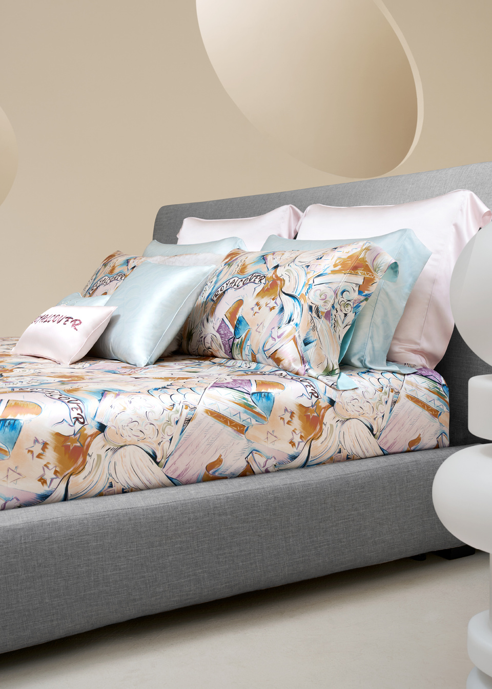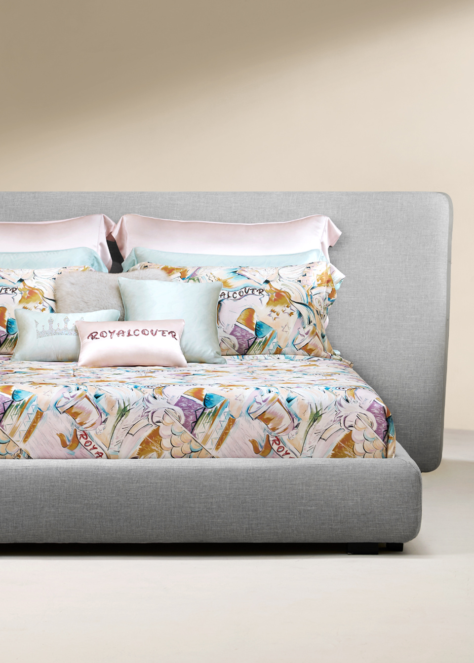 巴斯奎特的涂鸦绘画大胆运用想象力,玩转跨越不同领域的文化符号,一跃成为艺术宠儿。他的作品富有表现力且往往是抽象的,文字和语句也时常参与画面表达,在视觉上创造了属于他的符号。设计将涂鸦自由、随性的特点融入产品,以其独特的视觉效果和无拘无束的创作方式,为床品增添天马行空的想象力与前卫时尚,打造更为个性的外观设计。