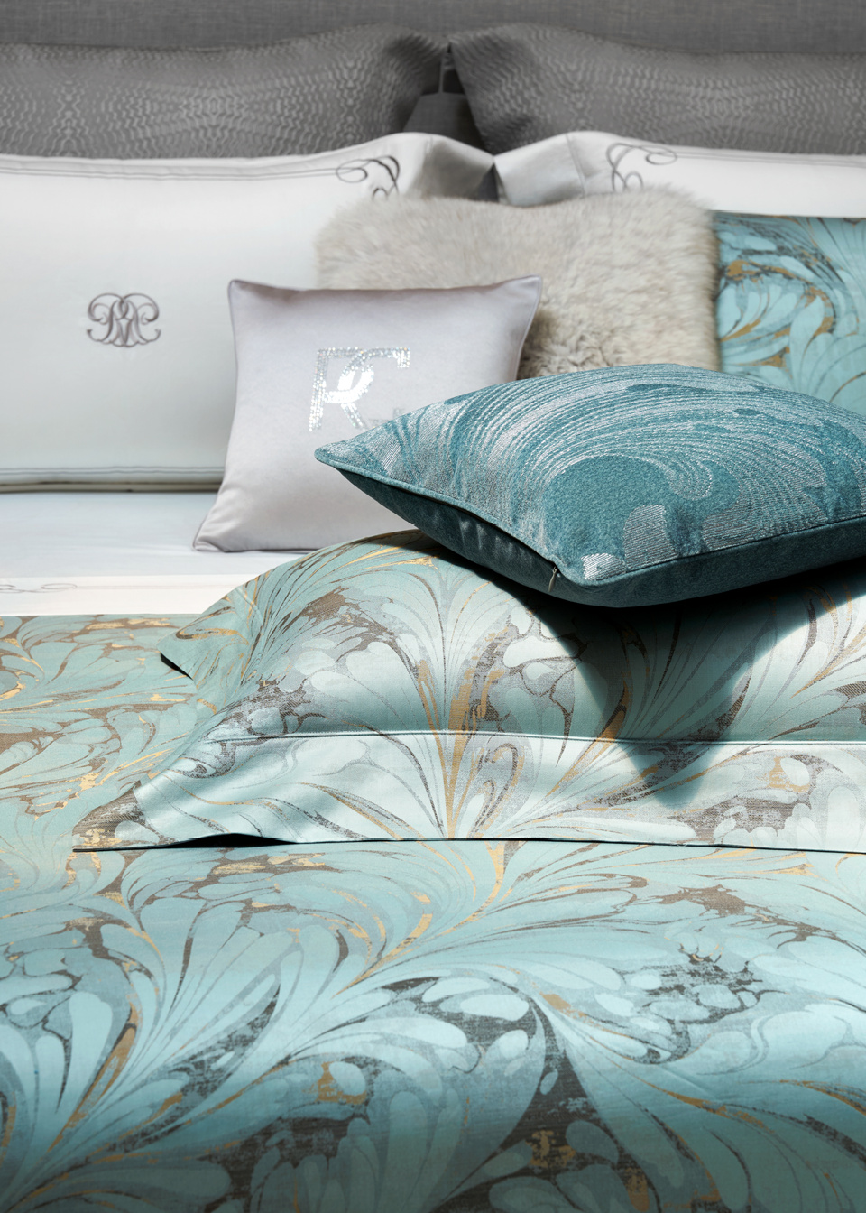 墨绿和翠蓝色相互交织,柔和的琉璃金色点缀,增加奢华感,色彩层次细腻丰富,结合经典的大地色系,高贵典雅,还原自然界的纯粹之美,整体呈现出大气浪漫的奢华感。